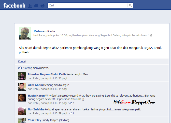 Inilaha muka doktor perubatan yang ditugaskan semasa hari pertabalan pertabalan Seri Paduka Baginda Yang Di-Pertuan Agong XIV, Tuanku Abdul Halim Mu'adzam Shah dengan mendakwa dalam FBnya yang ahli-ahli parlimen PR sebagai menghinakan Raja-Raja semasa majlis tersebut...